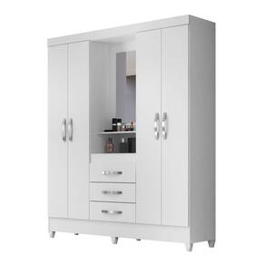 Características Estrutura em MDP de 12mm. Pintura em acabamento UV. 04 Portas articuladas com dobradiças metálicas. Espelho central. 03 Gavetas externas com corrediças metálicas. Cabideiros em alumínio. Amplo espaço interno com prateleiras. Puxadores na cor bronze. Pés em PVC.