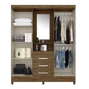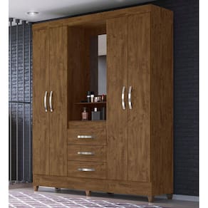 Características Estrutura em MDP de 12mm. Pintura em acabamento UV. 04 Portas articuladas com dobradiças metálicas. Espelho central. 03 Gavetas externas com corrediças metálicas. Cabideiros em alumínio. Amplo espaço interno com prateleiras. Puxadores na cor bronze. Pés em PVC.