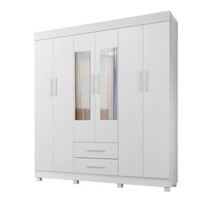 Guarda Roupa New Copacabana 6 Portas 2 Gavetas 7 Prateleiras Branco O Guarda-Roupa New Copacabana e produzido em chapa de 15 mm que garante robustez e maior vida util , contem 6 portas, 7 prateleiras, 2 gavetas com corredicas telescopica, cabideiro em aluminio, espaco para longos, pes incluso no produto e puxadores modernos , alem de ter espelho nas portas centrais otimo custo beneficio. Sua fabricacao utiliza a linha mdp perffect, que une a sustentabilidade a inovacao tecnologica, proporcionando durabilidade e facil limpeza; inspirando sofisticacao ao mobiliario. Sua pintura UV conta com boa resistencia, e facil de limpar e e ecologicamente correto, pois utiliza madeira de reflorestamento, evitando o desmatamento. Caracteristicas: Material principal: MDP Espessura da chapa: 15 mm Escala de brilho: semibrilho Sistema de montagem: parafuso, cavilha e cantoneiras metalicas Quantidade de Portas: 06 Quantidade de Prateleiras: 07 Quantidade de Gavetas: 02
