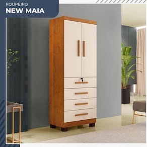 O Guarda Roupa Maia da Benetil e compacto e pratico. Possui bom espaco interno, possibilitando armazenar seus objetos de forma mais organizada. Conta com quatro gavetas, uma delas com chave, oferecendo mais seguranca. As gavetas sao em corredicas telescopicas, o que garante uma maior abertura. As portas de bater dao a ele um ar tradicional, mas com elementos que valorizam cada detalhe. O Cabideiro e em aluminio o que da mais seguranca e resistencia. Ele e compacto. Excelentes para quartos menores.
