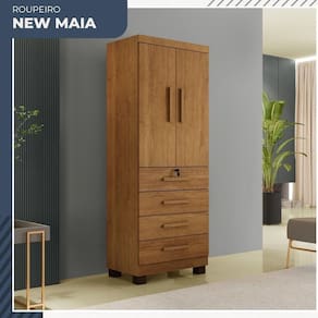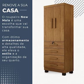 O Guarda Roupa Maia da Benetil e compacto e pratico. Possui bom espaco interno, possibilitando armazenar seus objetos de forma mais organizada. Conta com quatro gavetas, uma delas com chave, oferecendo mais seguranca. As gavetas sao em corredicas telescopicas, o que garante uma maior abertura. As portas de bater dao a ele um ar tradicional, mas com elementos que valorizam cada detalhe. O Cabideiro e em aluminio o que da mais seguranca e resistencia. Ele e compacto. Excelentes para quartos menores.