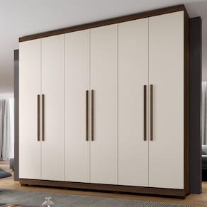 Guarda Roupa New Master 6 Portas 4 Gavetas 10 Prateleiras Imbuia Off O Guarda-Roupa New Master 6 portas e produzido em chapa de 15 mm que garante a vida util muito maior. Contem 6 portas e 10 prateleiras e nichos que acomodam suas roupas com maior conforto. Contem 4 gavetas espacosas com corredicas telescopicas que garante suavidade e durabilidade. cabideiro em aluminio, puxadores madeirados e pes inclusos. Sua fabricacao utiliza a linha mdp perffect, que une a sustentabilidade a inovacao tecnologica, proporcionando durabilidade e facil limpeza; inspirando sofisticacao ao mobiliario. Sua pintura UV conta com boa resistencia, e facil de limpar e e ecologicamente correto, pois utiliza madeira de reflorestamento, evitando o desmatamento. Caracteristicas: Material principal: mdp Espessura da chapa: 15 mm Escala de brilho: semibrilho Acabamento: Pintura UV Sistema de montagem: parafuso, cavilha e cantoneiras metalicas Quantidade de Portas: 06 Quantidade de Gavetas: 04 Quantidade de Prateleiras: 10