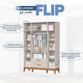 O roupeiro Flip 4 Portas areia, é ideal para futuras mamães que buscam organização, beleza e tranquilidade! Produzido em MDF com pintura UV atóxica, garante segurança para o bebê e alta durabilidade. Seu design funcional facilita o dia a dia e deixa o quarto ainda mais acolhedor.
