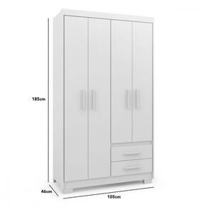 Características: - Estrutura em MDP de 12 e 15mm - 4 Portas - 2 Gavetas - Corrediça metálica - 04 Pés plástico - Cabideiro oblongo em alumínio - Puxadores em MDF - Acabamento de Pintura: Brilho - Suporte de peso das prateleiras, gavetas e cabideiros até 5kg - Garantia 12 meses
