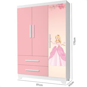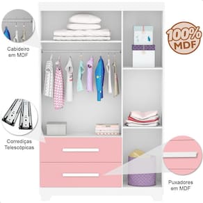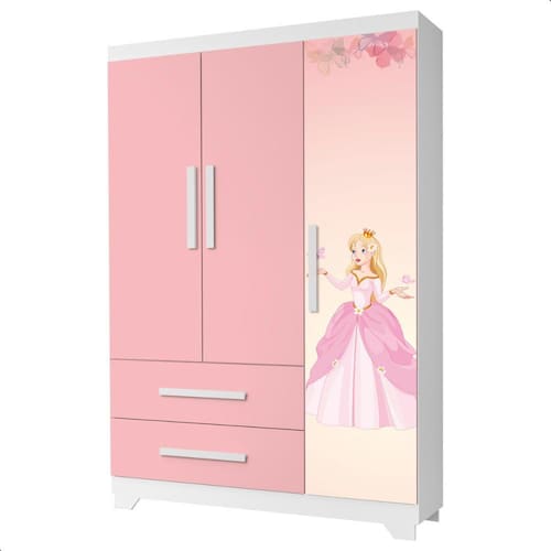 O Guarda roupa Princesa é produzido em MDF, com acabamento em pintura UV, Possui 3 Portas com amplo espaço interno, 2 gavetas com corrediças telescópicas, puxadores em MDF, nicho com varias repartições, cabideiro em em MDF, e pés em madeira maciça.