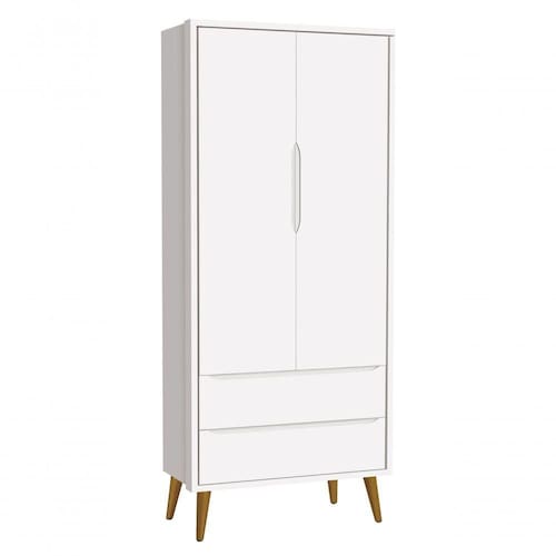O Guarda-Roupa 2PTs Theo New - MóveisAqui possui um estilo retrô com os pés em madeira maciça no estilo palito, possui um desing clean que combina com vários estilos de decoração. Contempla um espaço amplo e com divisórias internas para que as roupinhas do bebê possam ser organizadas e armazenadas com comodidade, não possui puxadores, as aberturas ocorrem através de recortes no MDF que possibilitam o perfeito encaixe da mão para a abertura das portas e gavetas.