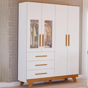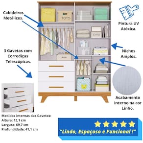 FICHA TÉCNICA -Guarda Roupa Infantil Retrô Altura: 209,6 cm Largura: 154,8 cm Profundidade: 49,8 cm Quantidade de Gavetas: 03 Gavetas (Peso suportado 4Kg) Quantidade de Portas: 04 Portas Material: 100% MDF Cores Disponíveis: Branco Brilho / Branco Brilho com Carvalho / Branco Brilho com Cinza Acabamento do Produto: Pintura UV Atóxica/ Pintura PU e Fita de Bordo Acabamento das Portas: Lisa Pintura UV Atóxica Tipo de Corrediça: Corrediça Telescópica Tipo de Cabideiro: Cabideiro Metálico Tipo de Puxadores: MDF revestido Tipo de Pés: MDF Rodapé: Desenho Retrô Embalagem: Peças envoltas em isomanta, caixa de papelão revestidas com plástico termoencolhível Manual de Montagem: Manual segue na embalagem do produto Guarda-Roupa Suporta Até (kg): 60 kg Peso: 103,6 kg