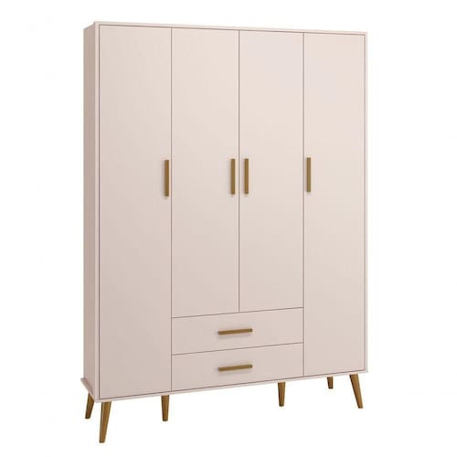 Guarda-roupa Retrô 4 Portas Isis Rosa Fosco - Moveisaqui O Guarda-Roupa Retrô 4 Portas Isis - MóveisAqui introduz um estilo retrô com os pés em madeira maciça, apresenta um desing clean que combina com vários estilos de decoração. Possui um espaço amplo e com divisórias internas para que as roupinhas do bebê possam ser organizadas e armazenadas com comodidade,puxadores em MDF ões do Produto Montado:Altura: 205 cmLargura: 148 cmProfundidade: 41 cmObservações:- 04 Portas;- 02 Gavetas;- Cabideiro Metálico;- Corrediças Telescópicas;- Sistema anti Tombamento;- Puxadores em MDF;- Pés na cor Madeira;- Pintura ultravioleta com acabamento fosco. Marca: Não Informado