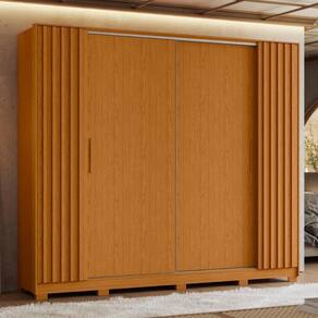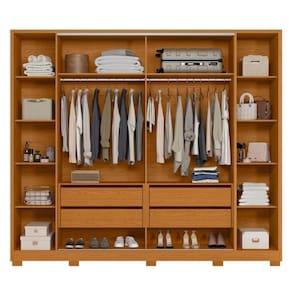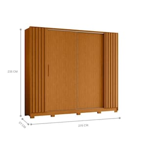 Feito em MDP.Possui detalhes nas portas laterais com acabamento ripado, 4 gavetas com corrediça telescópicas, 4 portas, 2 cabideiros e 10 prateleiras