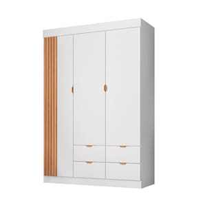 Características: Estrutura em MDF Acabamento em Pintura UV 03 Portas de bater com Dobradiças Metálicas 04 Gavetas externas com Corrediças Telescópicas Design em Ripado Cabideiros Incluso Puxadores Rosê Gold Prateleiras internas com amplo espaço