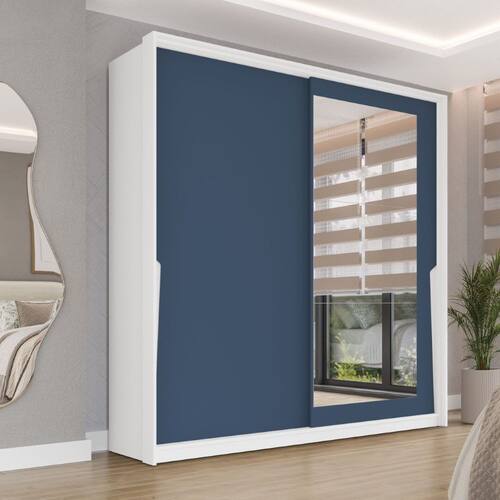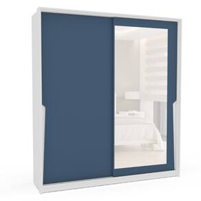 Guarda Roupa Roupeiro 2 Portas de Correr 2 Gavetas com Espelho Porto Branco Azul Politorno Móveis - Branco | Azul