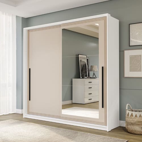 Características: Estrutura MDP Pintura FF/UV 02 Portas de Correr com Trilhos de Alumínio 02 Gavetas com Corrediças Telescópicas 04 Cabideiros em Alumínio 02 Maleiros Espaçosos Prateleiras com Amplo Espaço Puxadores Externos Detalhes Usinados Peso suportado nas Prateleiras Estruturais: 10kg Distribuídos Peso suportado nas Prateleiras: 5kg Distribuídos Peso suportado nas Gavetas: 3kg Distribuídos ACOMPANHA ESPELHO