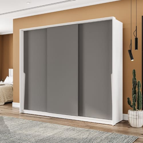 Guarda Roupa Roupeiro 3 Portas de Correr 4 Gavetas Porto Branco Cinza Politorno Móveis - Branco | Cinza