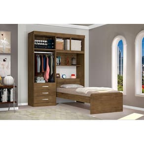 O Guarda Roupa com Cama Cancún 4 portas é ideal para otimizar o espaço do ambiente e deixar tudo organizado. Possui 3 nichos internos, 1 nicho externo, 1 baú na cabeceira, 4 portas articuladas, 3 gavetas externas com corrediças metálicas e 1 cama embutida tamanho solteiro. Possui pintura UV com acabamento texturizado amadeirado, que oferece ao produto resistência e durabilidade. O Roupeiro possui também o sistema flex, onde você pode escolher ao montar em qual lado a lateral com as gavetas irão ficar (lado direito ou esquerdo do móvel).