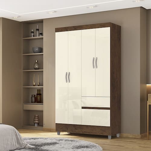 Características: Estrutura em MDP Pintura UV 04 Portas articuladas com dobradiças metálicas 02 Gavetas com corrediças metálicas Cabideiro de Madeira Puxadores de Plástico Astra Acompanha pés