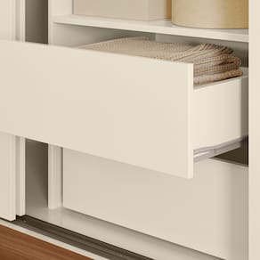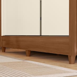 Fabricado em MDP 12 mm com acabamento em verniz brilhante e proteção UV, o roupeiro garante durabilidade e fácil limpeza. As portas deslizam suavemente sobre trilhos em ABS, otimizando o espaço do ambiente.