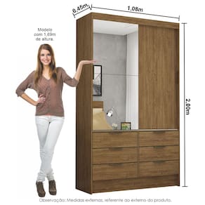 O Guarda-Roupa Sevilha com 2 portas de correr, 200cm de altura, 108cm de largura e 45cm de profundidade, combinado com 6 gavetas, 1 prateleira e 1 cabideiro, possibilita ao consumidor acomodar todas as roupas de maneira organizada e com maior visibilidade. As roldanas em aço e o trilho em alumínio potencializam o deslizar das portas.