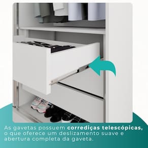 Estilo: modernoMaterial principal: MDF 15 mmEspessura do fundo e fundo da gaveta: 3 mmAcabamento: pintura texturizada UVEscala de brilho: foscaPortas: 2 portas de correrTipo de puxador da porta: embutido: Sim, de uma lado da cor do predominante do produto e do outro é Off-White.Número de prateleiras: 7Peso suportado por prateleira: 3 kgNúmero de gavetas: 3 gavetas internasTipo de corrediça da gaveta: metálica telescópicaPeso suportado por gaveta: 5 kgNúmero de cabideiros: 2Sistema de montagem: parafusos e cavilhas