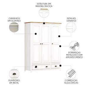 O Roupeiro conta com duas gavetas equipadas com corrediças telescópicas, que garantem deslizamento suave e amplo espaço de armazenamento. As portas contam com dobradiças metálicas com amortecimento e detalhes em madeira maciça que acrescentam um toque refinado ao móvel.