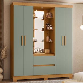 Com um camarim central, equipado com espelho e uma luminária de LED, oferece um ambiente perfeito para você se arrumar e se maquiar com facilidade e conforto. O Guarda Roupa conta com duas gavetas, que possuem corrediças telescópicas para um deslizamento suave e durável, oferecendo um ótimo espaço para armazenar roupas menores e acessórios de forma organizada. Os puxadores de MDF revestidos adicionam um toque refinado e moderno ao móvel, enquanto os dois cabideiros em alumínio garantem o suporte ideal para pendurar suas roupas de forma prática e eficiente. A estrutura do móvel também é reforçada com quatro portas de dobradiças metálicas, que oferecem resistência e durabilidade. Com uma combinação de compartimentos, gavetas e cabideiros, ele proporciona um ambiente organizado e otimizado. Seu design moderno e os acabamentos de alta qualidade tornam este móvel uma excelente escolha para quem busca aliar estilo e funcionalidade em seu Quarto.