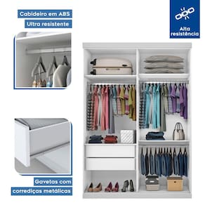 O Guarda-Roupa Salvador vai manter o seu quarto arrumado e com uma decoração moderna! Confeccionado com matérias de qualidade, ele possui 2 portas de correr e 2 gavetas com corrediças metálicas, garantindo assim a resistência ao abrir e fechar. Suas prateleiras são espaçosas e vão deixar as suas roupas sempre à mão. Demais não é? Leva! Dimensões: Altura; 218 cm Largura; 138 cm Profundidade; 53,5 cm Características: Estilo; Moderno Garantia; 03 Meses Acabamento; Pintura Possui Pés; Não Cor da Porta; Branco Possui Portas; Sim Tipo de Porta; Correr Possui Gavetas; Sim Tipo de Gaveta; Interna Escala de Brilho; Brilhante Possui Calceiros; Não Material da Porta; MDP Origem do Produto; Nacional Possui Cabideiros; 03 Ambiente Principal; Quarto Material da Gaveta; MDP Material Principal; MDP Possui Prateleiras; Sim Acabamento da Porta; Pintura Acabamento da Gaveta; Pintura Tipo de Guarda-roupa; Solteiro Material da Prateleira; MDP Acabamento da Prateleira; Pintura Complexidade da Montagem; Alta: deve ser montado por um montador especializado Tipo de Puxador da Porta; Externo Escala de Brilho da Porta; Brilhante Tipo de Puxador da Gaveta; Embutido Escala de Brilho da Gaveta; Brilhante Tipo de Corrediça da Gaveta; Metálica Simples Material do Puxador da Porta; Alumínio Escala de Brilho da Prateleira; Brilhante Tipo de Dobradiça/Corrediça da Porta; Alumínio Possui Espelhos; Não Gaveta com Chave; Não Necessita Montagem; Sim Resistente à Chuva; Não Possui Espaço para Vestidos Longos; Não Itens Inclusos; 1 Guarda Roupa e Manual de Montagem. Sistema de Montagem; Parafuso e minifix Peso Máximo por Gaveta; 6 kg Peso Máximo por Prateleira; 15 kg Possui Sapateira; Não Recomendações de Uso, Manutenção e Limpeza; Limpar com flanela limpa e seca. Não usar produtos abrasivos. Quantidade de Portas; 2 Quantidade de Gavetas; 2 Quantidade de Prateleiras; 2