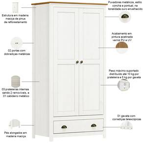 Fabricado em madeira maciça de alta resistência, esse guarda roupa 2 portas e 1 gaveta prova que espaços compactos podem ser incrivelmente funcionais e cheios de estilo. Com um cabideiro interno inteligente e prateleiras removíveis, esse guarda roupa americano se adapta às suas necessidades - seja para organizar camisas, calças ou acessórios. Para completar, a gaveta inferior mantém itens pessoais sempre à mão, mas discretos, enquanto os puxadores em concha acrescentam um toque especial ao design.