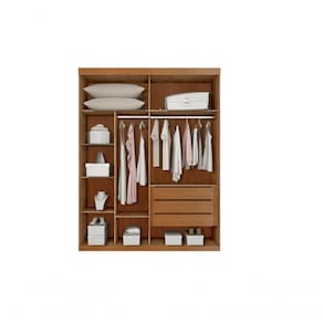 Com design moderno, o Guarda Roupa Búzios com 2 portas conta com a estrutura 100% em MDF. Além disso, conta com 3 gavetas internas com corrediças telescópica, cabideiros em alumínio, e com detalhes ripados na porta que da um charme a mais para esse móvel. Aproveite!