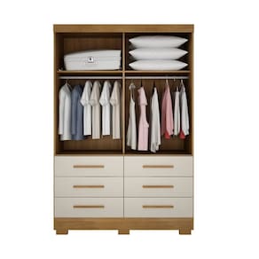 Particularidades do guarda-roupa: Características: - 100% MDP; - Puxadores com acabamento amadeirado; - 6 Gavetas com corrediças telescópicas; - Trilho inferior em alumínio; - Roldanas com rolamento; - Cabideiros em alumínio; - Pés inclusos;