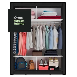 O espaço interno muito bom, com duas prateleiras e quatro nichos, além de um cabideiro de metal resistente e de tamanho diferenciado, 105 cm. Tem espaço para roupas longas, roupas mais curtas, malas, acessórios e muito mais.