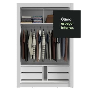 Espaço e organização: Perfeito para quarto de solteiro, o modelo conta com diversos nichos internos e quatro gavetas, que facilitam a organização de roupas, calçados e acessórios. O tubo cabideiro metálico é ideal para pendurar roupas longas.