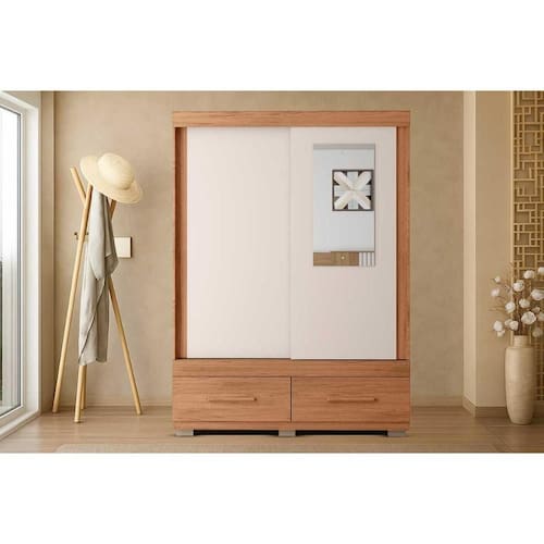Guarda Roupa Solteiro 2 Portas de Correr (1 c/ Espelho) e 2 Gavetas Sereno Freijo/Off White - Caemmun