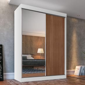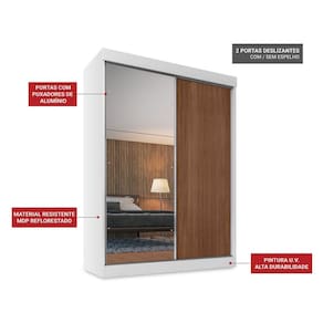 Guarda Roupa Solteiro 2 Portas de Correr 1 Porta com Espelho 2 Gavetas é composto por uma porta com espelho dividido em três painéis e uma porta em MDP, É um armário eficiente, possui múltiplas repartições para acomodar roupas e objetos, cabideiros e puxadores em alumínio, com o puxador acompanhando a altura da porta, guias superiores com molas, rodízios metálicos com roldanas em nylon e trilhos de alumínio que proporcionam melhor deslize das portas, 4 gavetas internas com corrediças metálicas, produzido em MDP com acabamento em pintura UV, proporcionando maior resistência e durabilidade, Os materiais utilizados são de primeira qualidade e respeitam o meio ambiente,