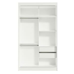 Internamente, contempla duas gavetas com corrediças metálicas, diversas prateleiras e nichos, além de dois cabideiros de madeira com espaço para roupas longas e curtas. A profundidade maior é um grande diferencial.