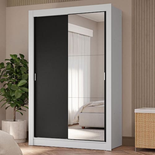 Portas de correr: O móvel é equipado com portas de correr que deslizam suavemente, graças aos trilhos em alumínio, garantindo um funcionamento tranquilo e sem esforço. Uma delas conta com espelhos, que são muito úteis no dia a dia e deixam o móvel ainda mais elegante.