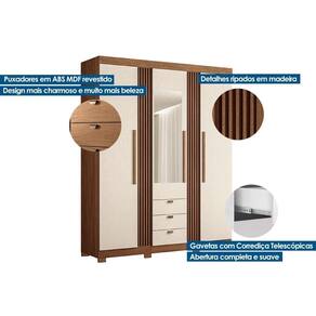 Material do Calceiro - Calceiro Metálico Tipo de Cabideiro - Aéreo Material dos Cabideiros - Cabideira Metálico Tipo de Porta do Guarda-Roupa - Portas de Bater Material das Portas - Portas em MDP Tipo de Dobradiças - Dobradiças Metálicas Diferenciais das Portas - Portas Ripadas - Porta c/ Espelho Quantidade de Portas - 3 Portas de Abrir Quantidade de Portas com Espelho - 1 Porta com Espelho Tipo de Espelho - Espelho Externo Quantidade de Espelhos - 1 Espelho Material das Gavetas - Gavetas em MDP Tipo de Corrediça - c/ Corrediças Telescópicas Quantidade de Gavetas - 3 Material de Estrutura Fundo Gaveta - Em HDF Tipo dos Pés - ABS/PVC Quantidade de Pés - 8 pés Material das Prateleiras - Prateleiras em MDP Quantidade de Prateleiras - 5