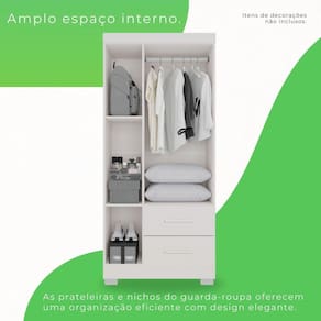 Organize e encontre com mais facilidade suas roupas preferidas! Com o Guarda Roupa Estrela você terá a praticidade de organizar suas coisas do seu jeito. Confeccionado com materiais de qualidade ele é a opção mais acertada para deixar seu dormitório muito mais arrumado. Você não precisa mais procurar, você acaba de encontrar o móvel perfeito para o seu dormitório pensando em como acabar com a desordem e aproveitar todo espaço para guardar roupas, acessórios e o que mais você desejar, ele é a opção perfeita para completar sua casa. Aproveite! Acabamento da Prateleira: Pintura UV Escala de Brilho da Prateleira: Brilhante Possui Cabideiros: Sim Acabamento da Gaveta: Pintura UV Possui Organizador de Gaveta: Não Acabamento da Porta: Pintura UV Escala de Brilho da Porta: Brilhante Material do Puxador da Porta: MDF Altura dos Pés: 5 Altura Máxima dos Pés: 5.0000 Ambiente Principal: Quarto codigo_ean: 7899931146399 Complexidade da Montagem: Média: pode ser montado por mais de uma pessoa e/ou necessite de maior conhecimento para montagem Cor: Branco Cor do Produto: Branco Escala de Brilho: Brilhante Gaveta com Chave: Não Itens Inclusos: 1 Guarda Roupa, Kit Ferragens e Manual de Montagem Linha ou Coleção: ESTRELA PREMIUM Manual de Montagem e Instalação: https://product-hub-prd.madeiramadeira.com.br/889200/documents/5f29fcc8-9623-47f7-840e-f4ca78fdd770peiroestrela3portassalleto.pdf Material da Gaveta: MDP Material da Porta: MDP Material da Prateleira: MDP Material dos Pés: Polipropileno Material Principal: MDP modular: Não Necessita Montagem: Sim Origem do Produto: Nacional Peso: 38,7 kg Peso Máximo por Gaveta: 5 kg Peso Máximo por Prateleira: 3 kg Possui Calceiros: Não Possui Espelho: Não Possui Pés: 04 Possui Portas: Sim Possui Prateleiras: Sim Produto Montado: Sim Quantidade de Gavetas: 02 Gavetas Recomendações de Uso, Manutenção e Limpeza: Limpar com flanela ou pano macio seco. Não utilizar produtos abrasivos. Não expor o produto diretamente à luz solar e à umidade. Sistema de Montagem: Parafusos, Cavilhas , Minifix, Dobradiças e Puxadores. Tipo de Corrediça da Gaveta: Metálica Simples Tipo de Dobradiça/Corrediça da Porta: Metálica Tipo de Gaveta: Externa Tipo de Guarda-Roupa: Solteiro Tipo de Puxador da Gaveta: Externo Tipo de Puxador da Porta: Externo