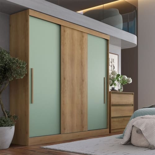 Características: 2 Gavetas 3 Portas de correr 2 Puxadores MDF 7 Tampos fixos Cabideiros em metal Corrediças e Dobradiças metálicas Espaços para sapatos Estrutura em MDP de 12 e 15mm Fundos do roupeiro e gavetas em MDF de 3mm Sistema de montagem com parafusos e minifix