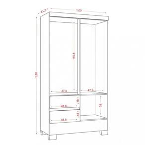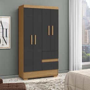 Características: Estrutura em MDP de 12mm e 15mm 4 Portas Dobradiças metálicas Puxadores de MDF 25mm 2 Gavetas Corrediças metálicas Cabideiro de madeira revestido em PVC Acabamento em verniz texturizado fosco Pés em PVC