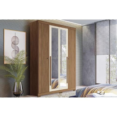 Guarda Roupa Solteiro 4 Portas (2 Ripadas e 2 c/ Espelho) e 2 Gavetas c/ Pés Buriti Jatobá/Areia - Santos Andirá - Blush