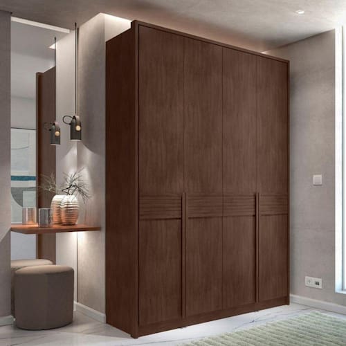 Amplo e imponente, oRoupeiro Jazzé a pedida certa para criar um dormitório bem-organizado! Dividido em4 portas e 3 gavetas, ele acomoda bem desde as peças que precisam ir aos cabideiros até as que podem ser dobradas e empilhadas, além de ter nichos inferiores adequados para calçados. Um dos seus maiores diferenciais é que em suas portas existe um aplique de MDF dando todo um charme no produto. Puxadores alongados produzidos em MDF.