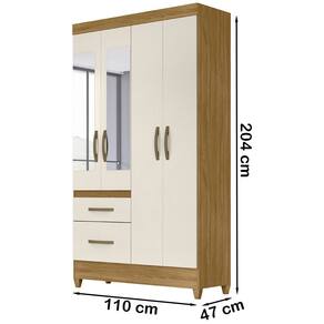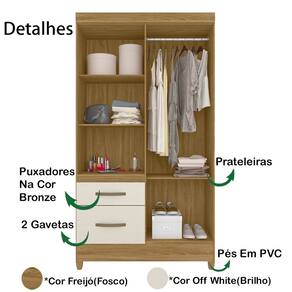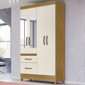 Guarda Roupa Solteiro 4 Portas Com Espelho, oferece uma ótima modernização e sofisticação ao ambiente. Estrutura em MDP de 12 e 15 mm, fundos em MDF de 2,5 mm que proporcionam melhor acabamento nas bordas e superfícies, e pintura com acabamento em UV(Freijó-Fosco/Off White-Brilho). Composto por 4 portas articuladas, sendo duas com espelhos, 2 gavetas externas com corrediças metálicas, 3 prateleiras, 1 cabideiro e um nicho para sapatos, puxadores na cor bronze e acompanham pés em PVC. Desenvolvido para deixar seu dormitório mais elegante. Este móvel chegará na sua casa separado em 03 volumes.