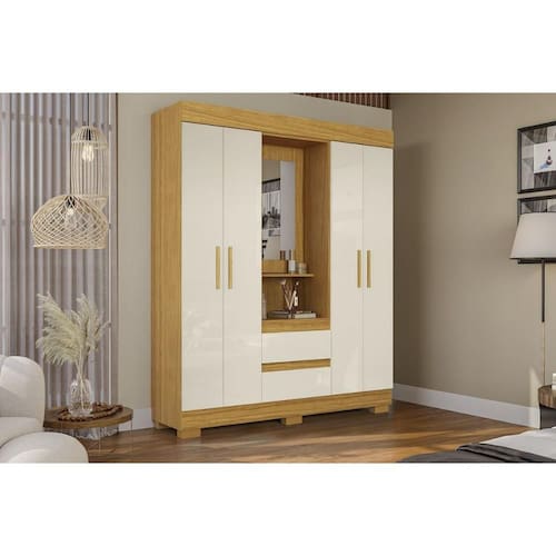 Guarda Roupa Solteiro 4 Portas e 2 Gavetas c/ 1 Espelho Isabely Nature/Off White - ACP
