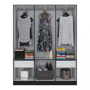 Características: Estrutura em MDP de 12mm 6 Portas 6 Nichos 3 Cabideiros em madeira 2 Gavetas com capacidade de até 3kg Corrediças metálicas Puxadores de Plásticos Acabamento interno na tonalidade ártico
