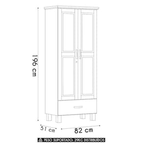 Com portas com detalhes usinados e dobradiças metálicas, o Guarda Roupa oferece resistência e segurança, com uma das portas equipada com chave. Suas três prateleiras garantem organização eficiente, e o cabideiro de alumínio proporciona suporte adicional para roupas penduradas. O amplo espaço interno permite acomodar tudo de forma prática e acessível.