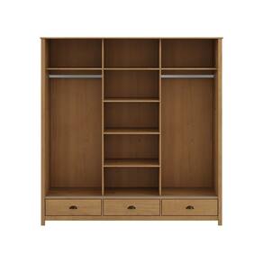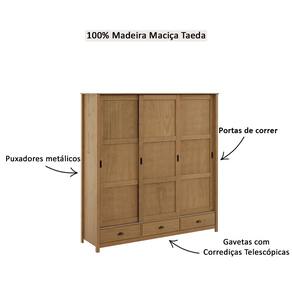 Características: Estrutura em Madeira Maciça Pinus Taeda de reflorestamento Pintura Semi-brilho 03 Portas de correr 03 Gavetas com corrediças telescópicas (peso máximo suportado 05kg distribuídos) Cabideiros em alumínio (peso máximo suportado 08kg distribuídos) Puxadores metálicos em ouro envelhecido Pés alongados em madeira Amplo espaço para armazenamento Prateleiras maciças (peso máximo suportado 10kg distribuídos)