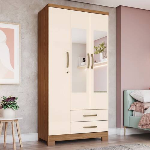O(a) Guarda-Roupa Solteiro Açaí 3 Portas 2 Gavetas com Espelho Natural/ Off White - Henn é produzido em MDF e MDP na escala de brilho Brilho, e possui um grau de dificuldade de montagem: Médio.