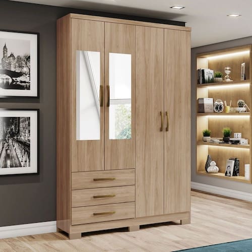 O(a) Guarda-Roupa Solteiro Caju 4 Portas e 3 Gavetas com Espelho Jequitibá - Henn é produzido em MDP na escala de brilho Brilho e Fosco, e possui um grau de dificuldade de montagem: Médio.