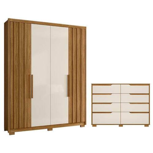 Começou a montar seu quarto? Então apresentamos para você este belo conjunto composto pelo guarda roupa da linha Califórnia e a cômoda da linha Georgia. O guarda roupa conta com quatro portas, sendo duas com detalhes ripados em MDF, três gavetas internas e puxadores em MDF. Destaque são as duas opções na hora de montar as portas, oferecendo mais versatilidade de acordo com seu gosto. Complementando o conjunto, a cômoda possui oito gavetas. Os puxadores usinados dão um acabamento elegante. Tanto o guarda roupa, quanto a cômoda possuem corrediças telescópicas e pés em PVC oferecendo mais estabilidade e resistência. Produzidos pela Moval, são desenvolvidos em MDP de qualidade, unindo estilo, praticidade e ótimo aproveitamento de espaço. Aproveite e garanta já o seu!