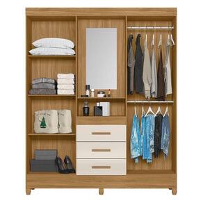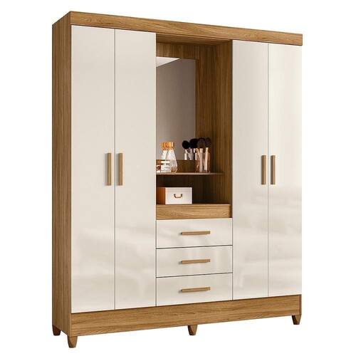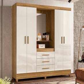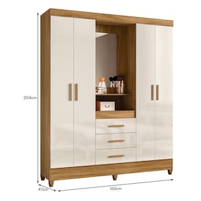Guarda Roupa Solteiro Capelinha Capri 4 Portas E 3 Gavetas Freijó/off White Com Espelho - Moval Freijó/off White Guarda Roupa Solteiro Capelinha Capri 4 Portas e 3 Gavetas com Espelho - Moval O Guarda-Roupa Solteiro Capelinha Capri 4 Portas e 3 Gavetas com Espelho é a escolha ideal para quem busca organização e praticidade com um toque clássico. Produzido em MDP com pintura UV, oferece resistência e durabilidade. Suas quatro portas possuem puxadores em MDF, e a capelinha central com espelho traz funcionalidade e charme ao móvel. Conta com três gavetas com corrediças metálicas para facilitar a organização de pequenos itens, além de prateleiras internas que garantem melhor aproveitamento do espaço. O cabideiro e o calceiro em alumínio proporcionam mais praticidade no armazenamento das roupas, enquanto os pés em PVC oferecem estabilidade e segurança. ESPECIFICAÇÕES: - Estrutura em MDP - Pintura UV - 4 Portas - Dobradiças metálicas - 3 Gavetas - Corrediças metálicas - Interna com prateleiras - Cabideiro e calceiro em alumínio - Capelinha central com espelho - Puxadores em MDF - Pés em PVC