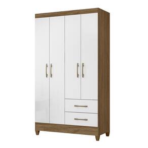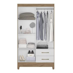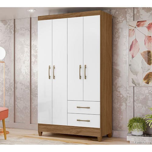Características Estrutura em MDP de 12mm. Pintura em acabamento UV. 04 Portas articuladas com dobradiças metálicas. 02 Gavetas externas com corrediças metálicas. Cabideiros em madeira. Amplo espaço interno com prateleiras. Puxadores na cor bronze. Pés em PVC.